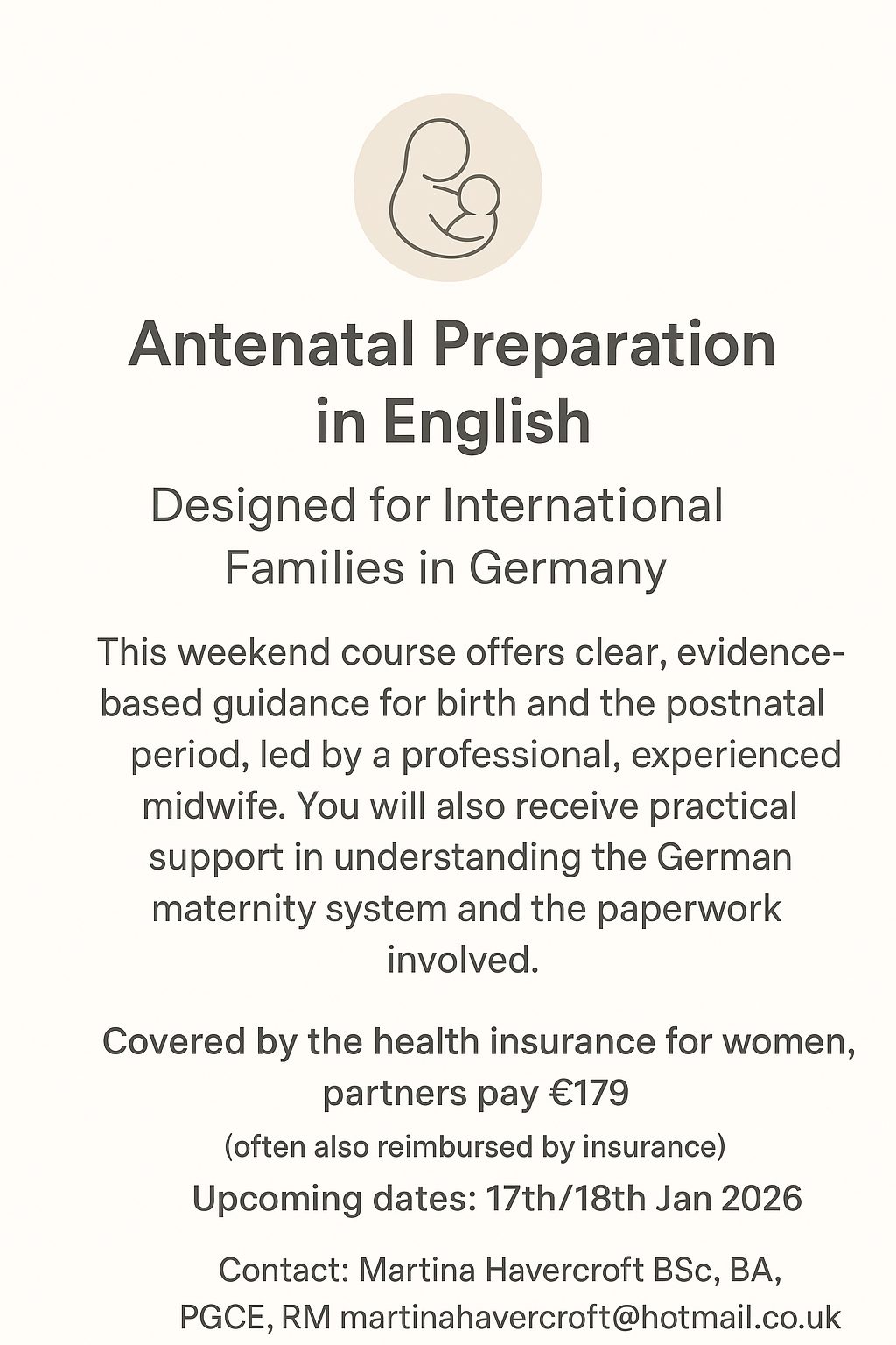 Unser englischsprachiger Geburtsvorbereitungskurs richtet sich an internationale Familien, die in Deutschland leben und sich gut informiert, sicher und begleitet auf die Geburt vorbereiten möchten. Du erhältst alltagsnahe, evidenzbasierte Informationen sowie praktische Unterstützung im Umgang mit dem deutschen Gesundheitssystem. Der Kurs wird von einer erfahrenen Hebamme geleitet und schafft Raum für Austausch und persönliche Fragen.