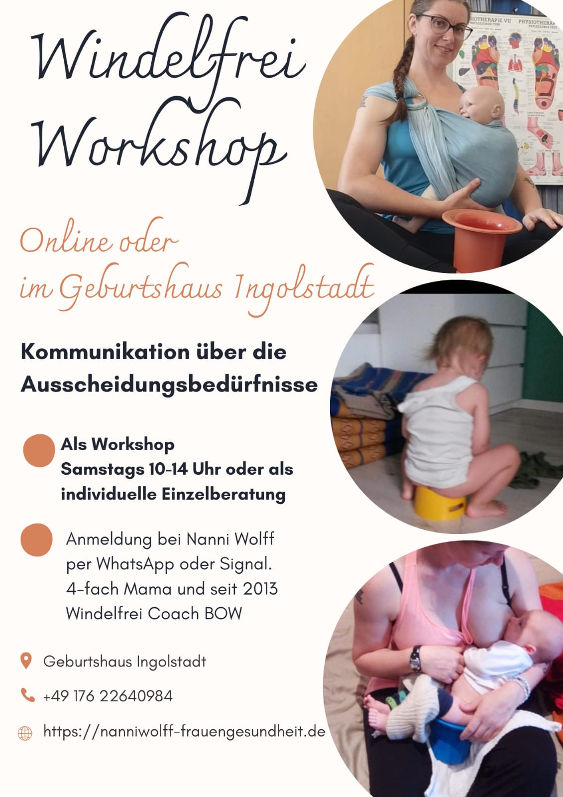 Windelfrei bedeutet, die Bedürfnisse deines Babys auf einer neuen Ebene zu verstehen. In diesem Workshop bekommst du Orientierung, Sicherheit und viele praktische Ideen, wie du Ausscheidungskommunikation entspannt in euren Alltag integrieren kannst – egal ob ihr schon erste Erfahrungen gesammelt habt oder ganz neu startet. Du kannst den Kurs online oder im Geburtshaus besuchen. Nanni Wolff begleitet dich mit viel Erfahrung, Empathie und praxisnahen Tipps.